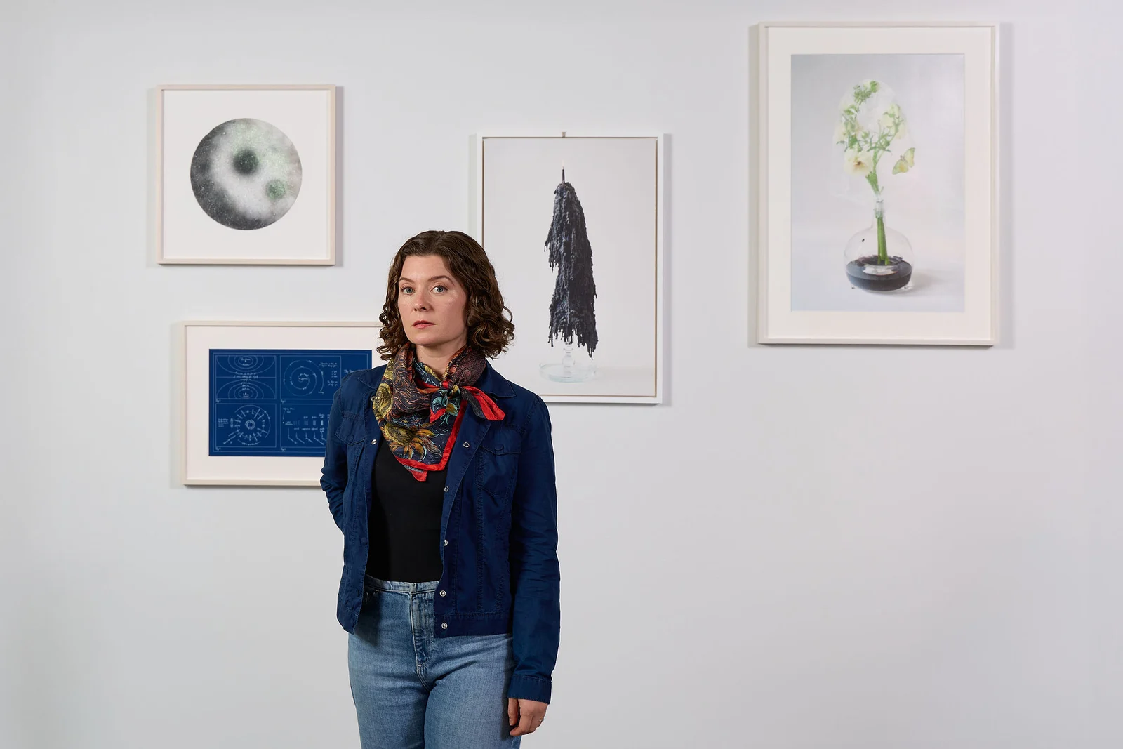 Crump’s work explores the realms of magic and myth, using time-based processes to coax quiet phenomena to the surface. For Release emerged as a means to overcome a period of creative block for the artist. Over the course of nine months, she created and burned candles, letting layers of wax accumulate. “Each time I sat with a burning candle, I offered my fears to the flame,” she writes. The final photograph, faintly scorched at the top edge of the frame, is a quiet record of heat, containment, and letting go. In Spells for Protection, smoke from burned herbs marks silk, to which Crump responds by drawing in graphite and mica. The drawings are then submerged into brine to grow salt crystals into the fibers. This process was inspired by the Scottish folk practice known as saining, intended for ritual purification. Catching My Breath pairs a flycatcher vessel with flowers, all covered under the seal of plastic, and is a haunting meditation on breath and impermanence. Finally, The Parting Gift: Diagrams for Being reimagines drawings by her grandfather (a scientist whom she never got a chance to meet) translated from his yellow notecards into cyanotypes that read like blueprints for living, tracing ideas of cosmic flow and our place in the world.